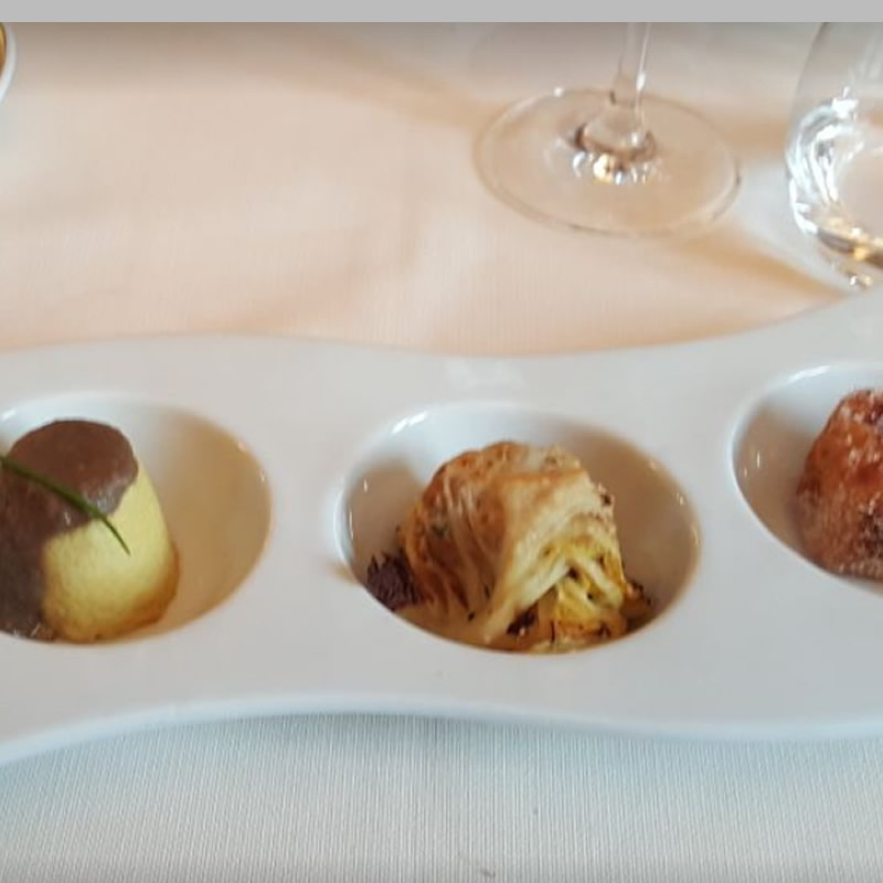 (Caldi: crema di Maccagno con dadolata di paletta, flan di cavolo cappuccio con delicata bagna caoda, capunet ai tre arrosti, semolino dolce; Freddi: trota in dolce carpione, magatello in classica salsa tonnata, lingua di vitello in leggera salsa verde, crostino con formaggio sancarlino)